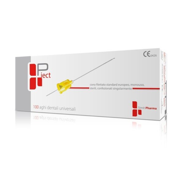 Aghi sterili monouso per anestesia dentale con attacco filettato, punta siliconata a triplice affilatura trattata e indicazione sul cono dell’orientamento della punt