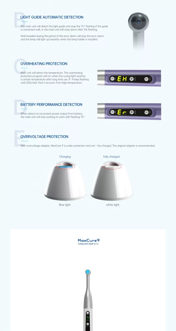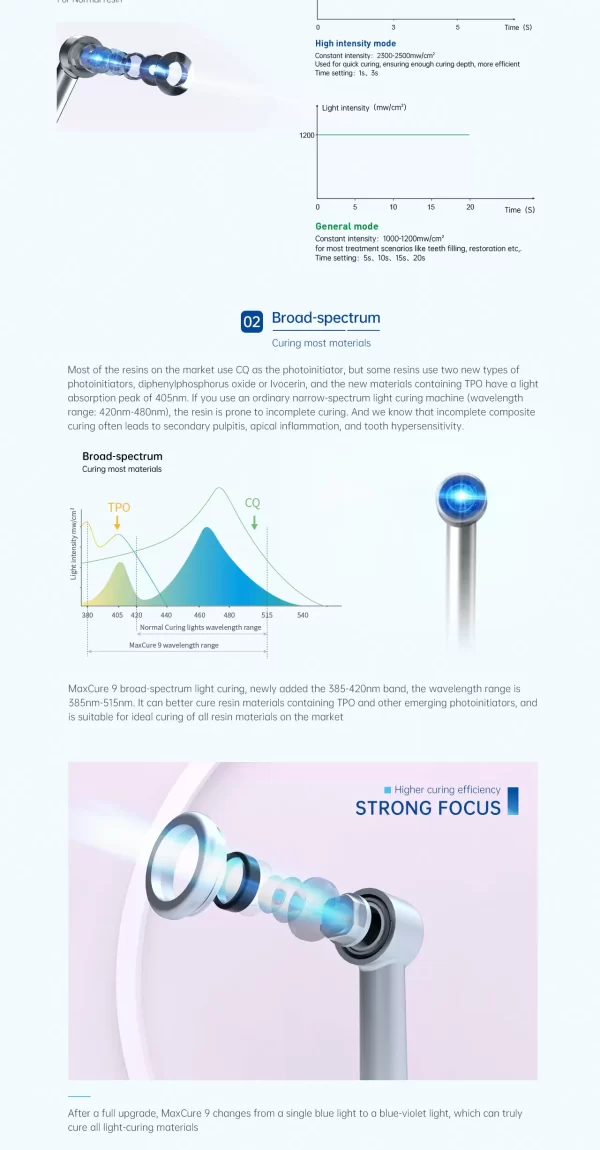MaxCure 9 fotopolimerizzazione ad ampio spettro, aggiunta di recente la banda 385-420nm, la gamma di lunghezze d’onda è 385nm-515nm. Può polimerizzare meglio i materiali in resina contenenti TPO e altri fotoiniziatori emergenti ed è adatto per la polimerizzazione ideale di tutti i materiali in resina sul mercato, MaxCure 9 passa da un’unica luce blu a una luce blu-viola, che può veramente polimerizzare tutti i materiali fotopolimerizzabili