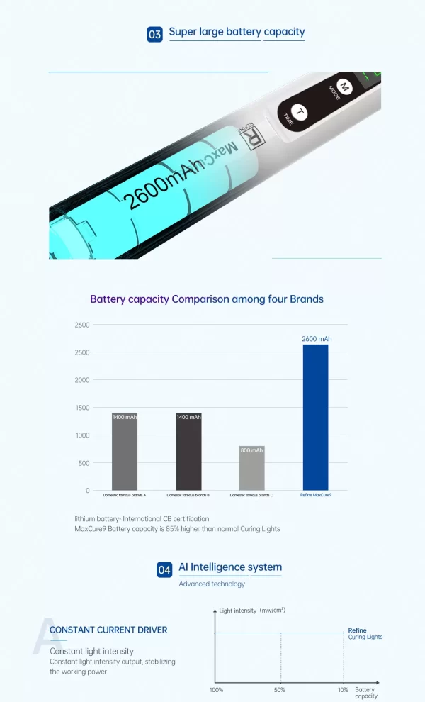 MaxCure9 La capacità della batteria è superiore dell’85% rispetto alle normali lampade polimerizzanti